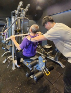 トレーニング前にお体の調子をお聞きしたところ、肩甲骨周りの硬さが気になる様子でしたので、肩甲骨周りを動かす上半身のトレーニングを中心に行いました。